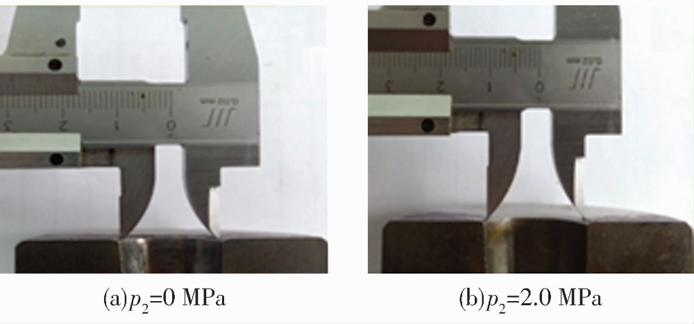 在上述無背壓的“穿膛過”磨粒流加工條件下,將加工后的工件線切割開,可以明顯看出進(jìn)出口處的尺寸d1,大于中間區(qū)域的尺寸d0,并形成“喇叭口”。出現(xiàn)該結(jié)果的主要原因是由于黏彈性磨料在出口處的突然擠入與釋放時形成的擠壓壓力過大,從而在工件兩端出現(xiàn)嚴(yán)重的過拋現(xiàn)象,嚴(yán)重影響空心滾子的尺寸。為避免“喇叭口”的形成,應(yīng)該控制進(jìn)出口的壓差,使磨粒流在加工過程中實(shí)現(xiàn)均勻的擠壓運(yùn)動。因此,在擠壓過程中對磨粒流施加一個回程壓力,即背壓P2與“穿膛過”式(背壓P2為零)的情況相比,在擠壓過程中增加磨料流回程壓力,可以降低壓力在進(jìn)出口處的突變,實(shí)現(xiàn)進(jìn)出口處壓力的小壓差調(diào)節(jié),從而有效抑制“喇叭口”的形成,其原理如圖6所示。