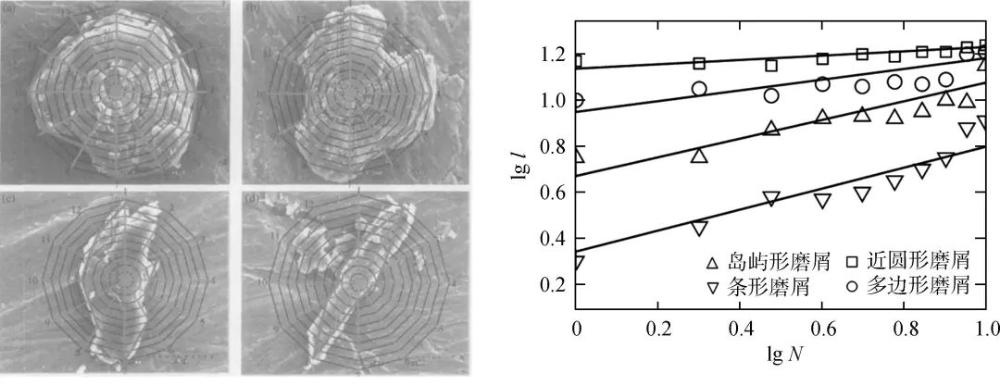圖5 不同輪廓的磨屑輪廓雷達(dá)圖表征及其雙對(duì)數(shù)坐標(biāo)[58]
