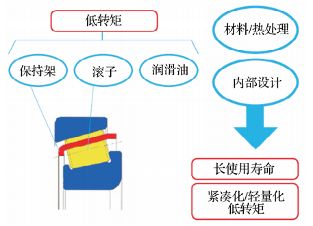 通過材料、熱處理、內(nèi)部設(shè)計(jì)參數(shù)的變化以及諸如密封、保持架、潤滑脂的改進(jìn)(圖1),實(shí)現(xiàn)低轉(zhuǎn)矩的要求和緊湊化、輕量化的設(shè)計(jì)。